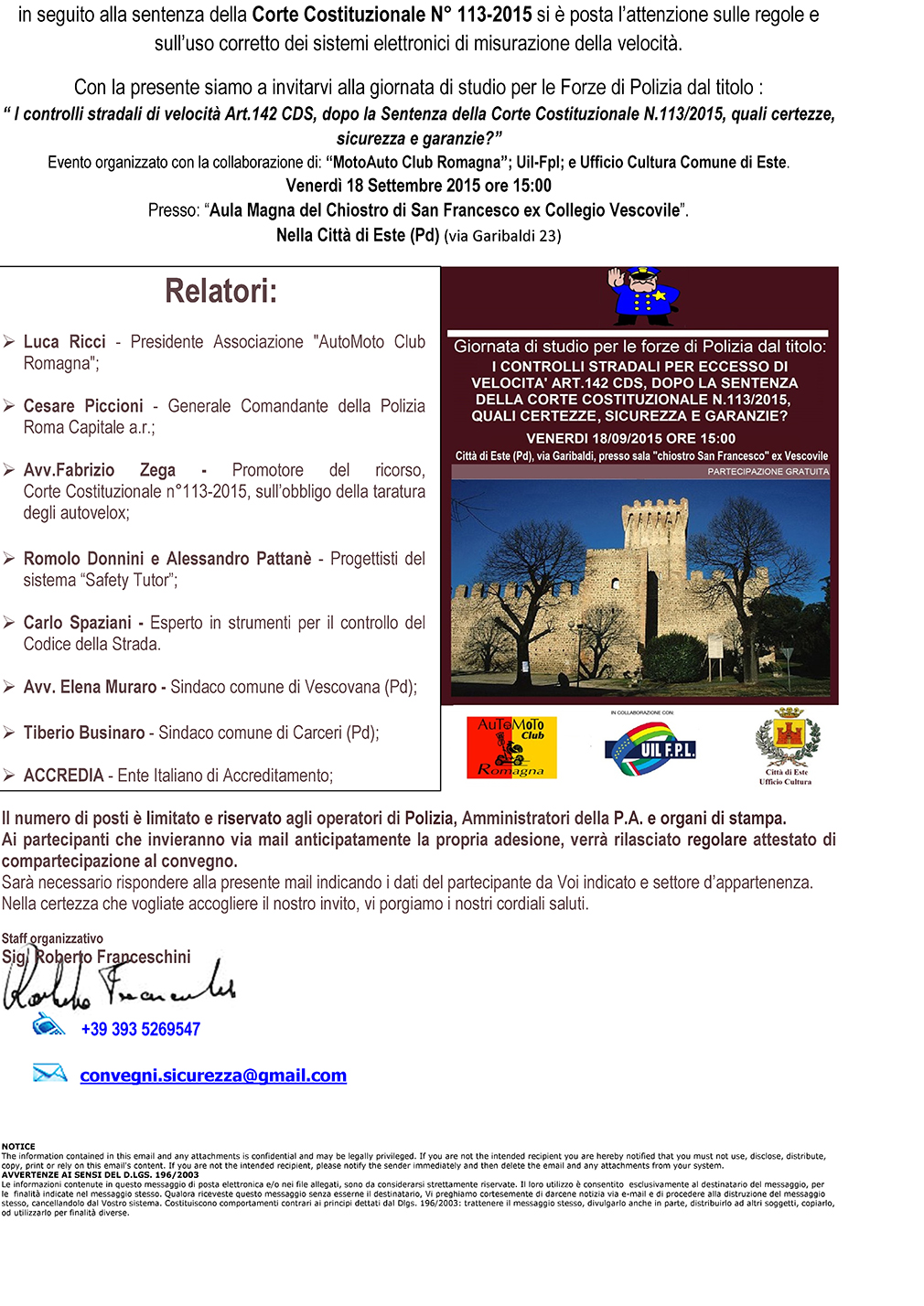 In allegato il modulo di adesione e il programma del convegno che si terrà ad Este il 18.09.2015.
