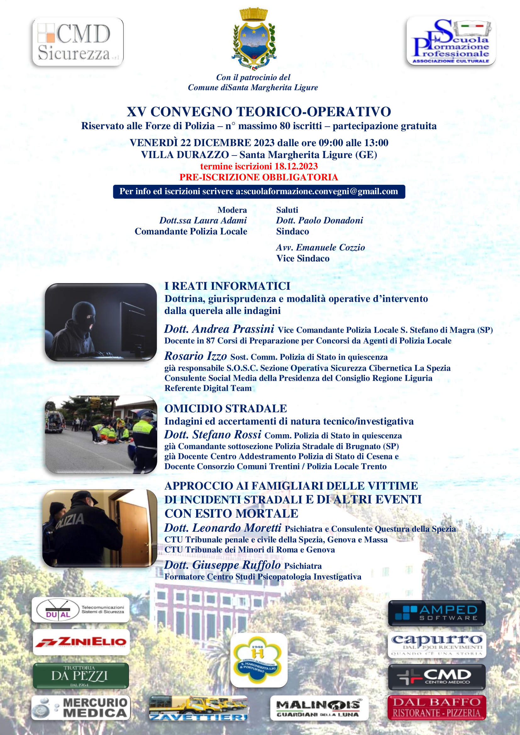 Evento gratuito e riservato Corpi di Polizia Patrocinio Comune di Santa Margherita Ligure (GE) Organizzazione a cura: Comando Polizia Locale Ass.ne Culturale Scuola di Formazione Professionale Venerdì 22 dicembre 2023 dalle ore 09:00 alle 13:00 Santa Margherita Ligure (GE) Villa Durazzo, favolosa villa del 1600 www.villadurazzo.it Numero massimo 80 iscritti Preiscrizione obbligatoria entro il 18.12.2023 Info/iscrizioni: scuolaformazione.convegni@gmail.com Programma: