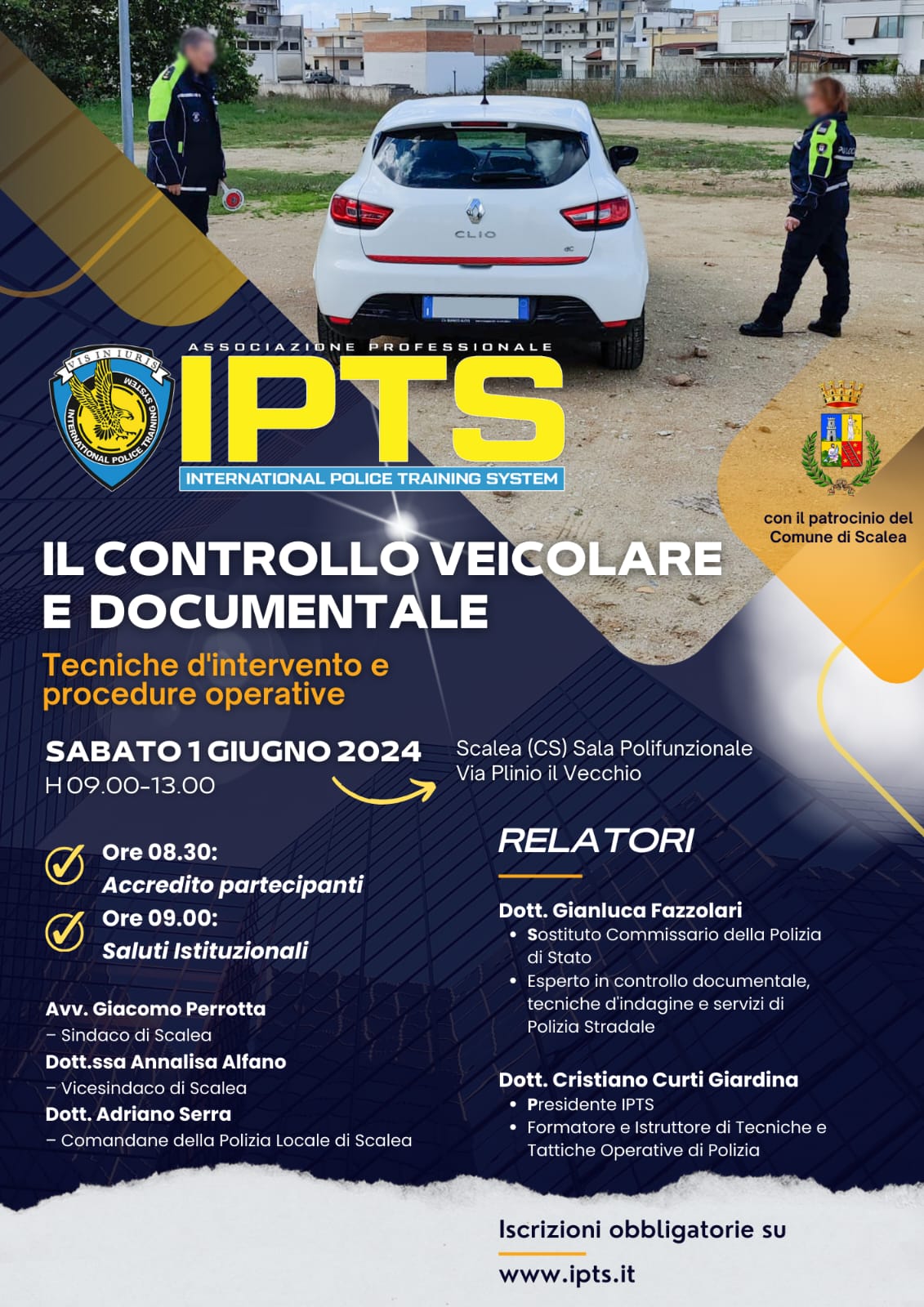 Giornata di studio gratuita organizzata dall’Associazione Professionale IPTS con il Patrocinio del Comune di Scalea, è aperto ai Dirigenti, Ufficiali e Agenti di Polizia Locale e agli appartenenti alle Forze di Polizia Nazionali.